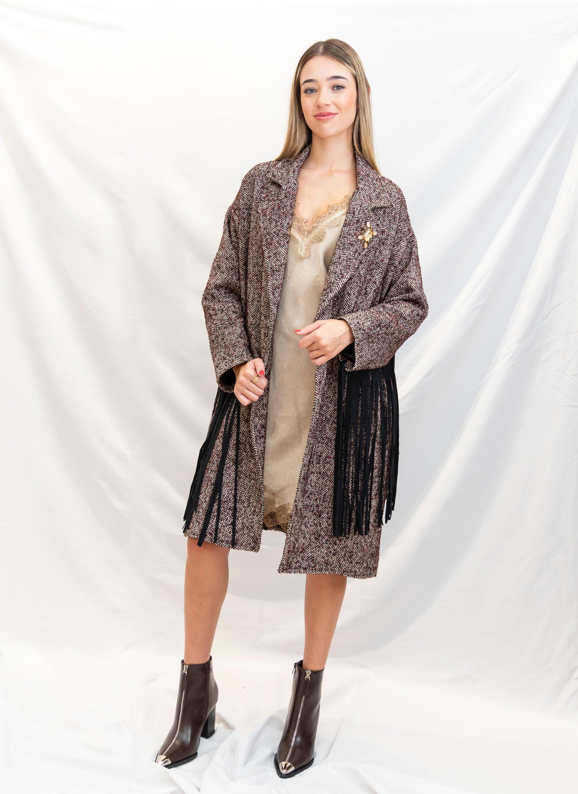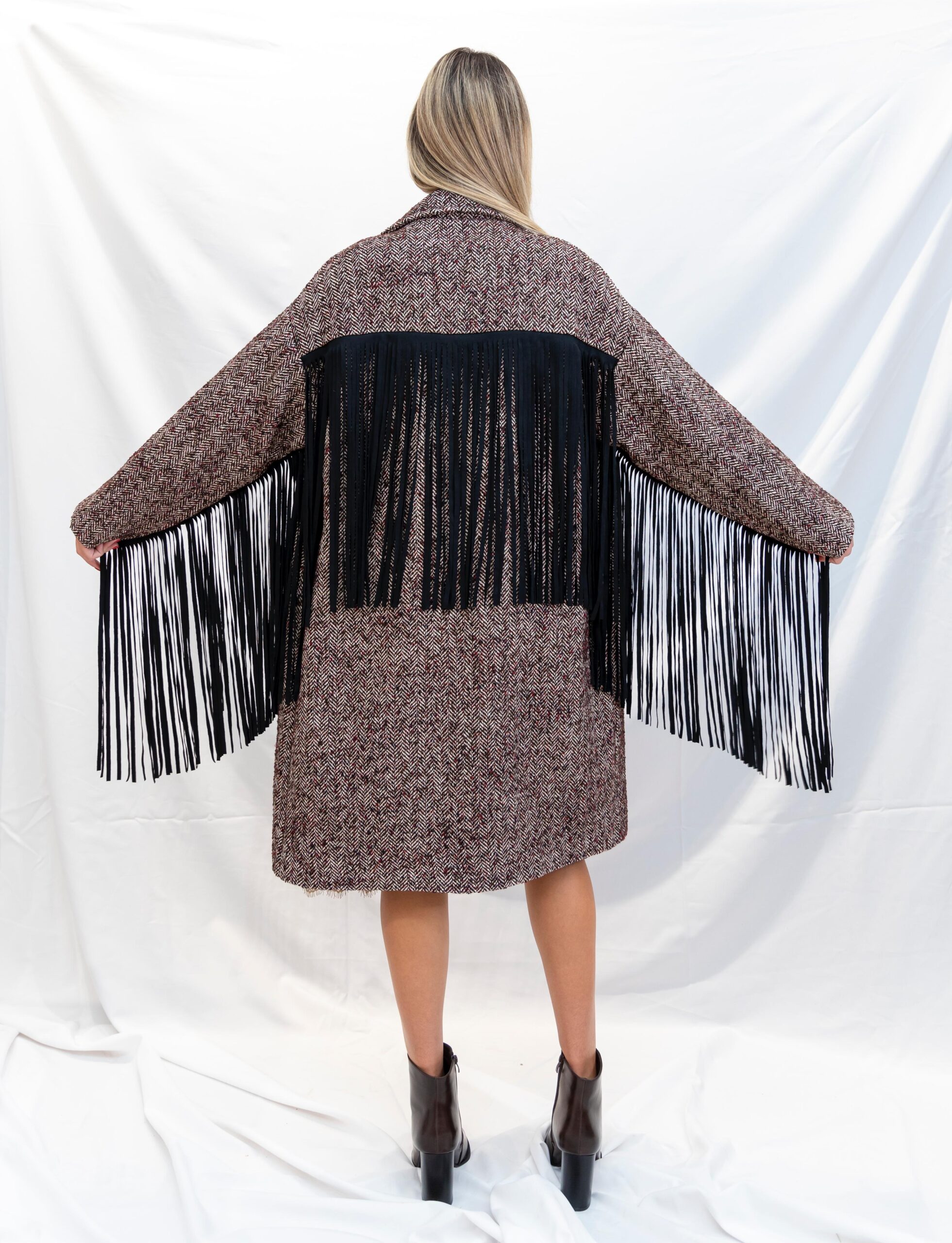 Abrigo en tejido de espiga con flecos XL en ante negro, de la firma D’l. Una pieza con carácter, que combina la elegancia del tweed con el toque bohemio más actual.