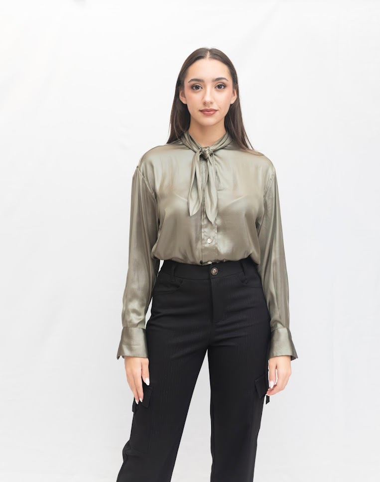 Su tono verde oliva aporta sofisticación y versatilidad, convirtiéndola en una pieza perfecta tanto para estilismos de oficina como para looks más especiales. El diseño incorpora un cuello con lazada, que puedes anudar para un estilo más clásico o dejar suelto para un aire moderno y relajado. Las mangas largas con puño ancho aportan un acabado refinado y estructurado.