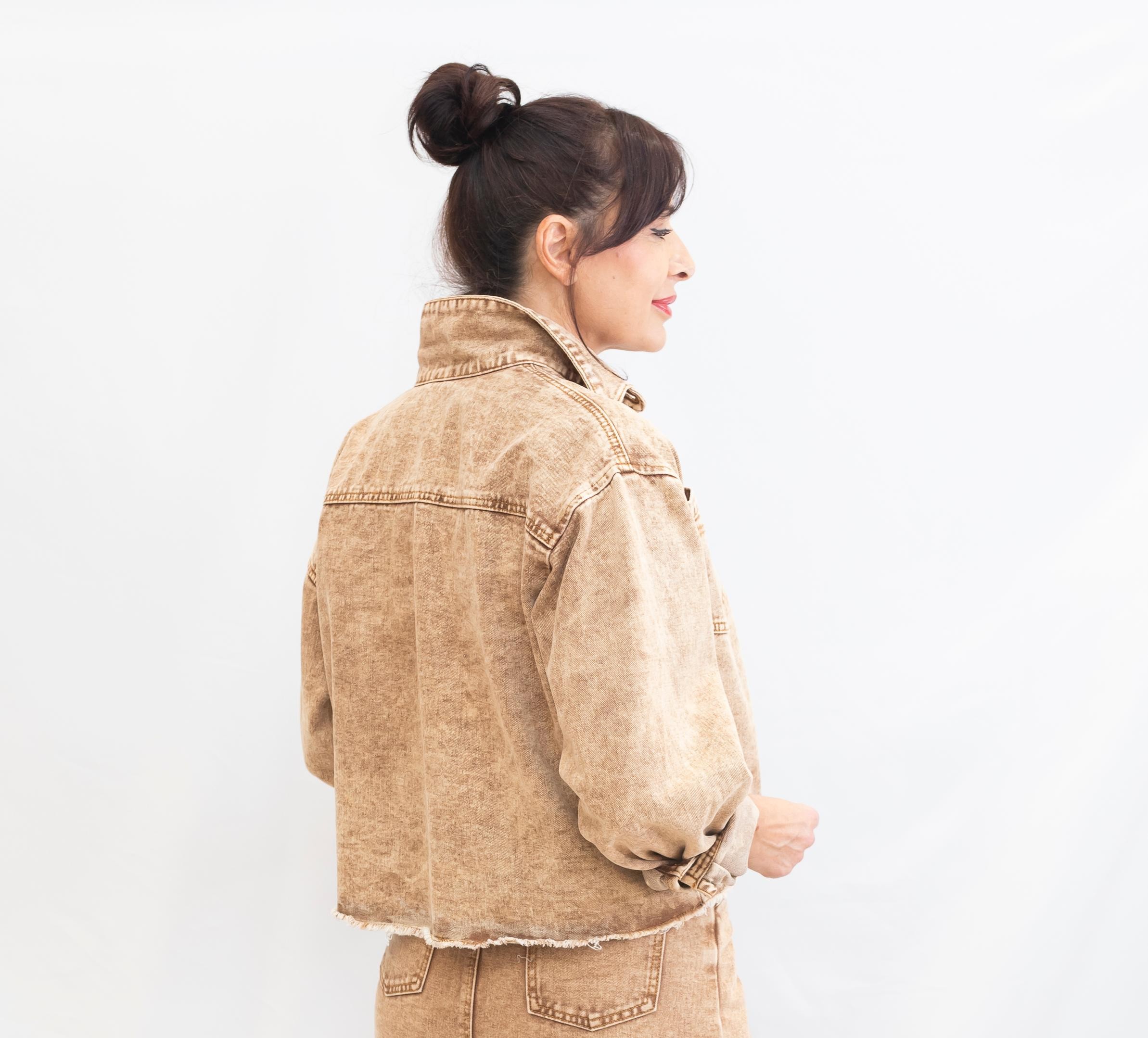 Confeccionada en 100% algodón, presenta un acabado lavado en tono camel que le aporta carácter y personalidad. Su corte ligeramente oversize, los bolsillos frontales y el bajo deshilachado la convierten en una pieza versátil y con mucho estilo.