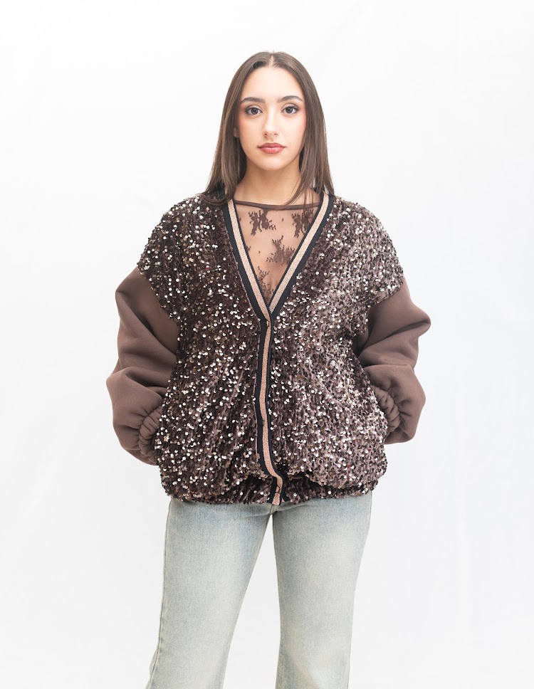 Chaqueta con cuerpo de lentejuelas bronce y mangas de punto en tono chocolate. Un diseño espectacular de D’l Giulia Mastini que combina brillo, estilo y confort. Perfecta para elevar cualquier look.