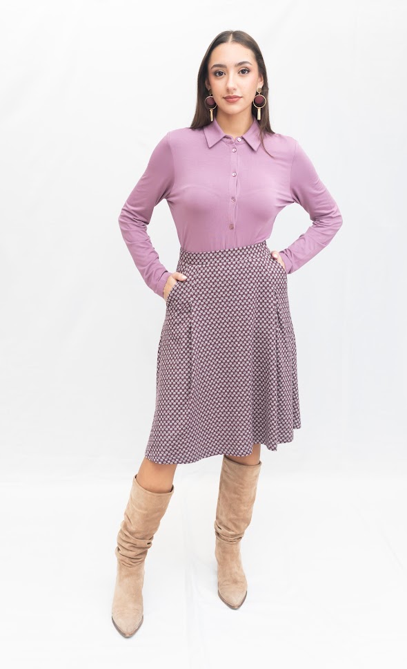 Falda midi con estampado geométrico en tonos burdeos y rosa. Su tejido con poliéster reciclado y elastano aporta comodidad, movimiento y sostenibilidad. Una prenda femenina y versátil de Surkana.