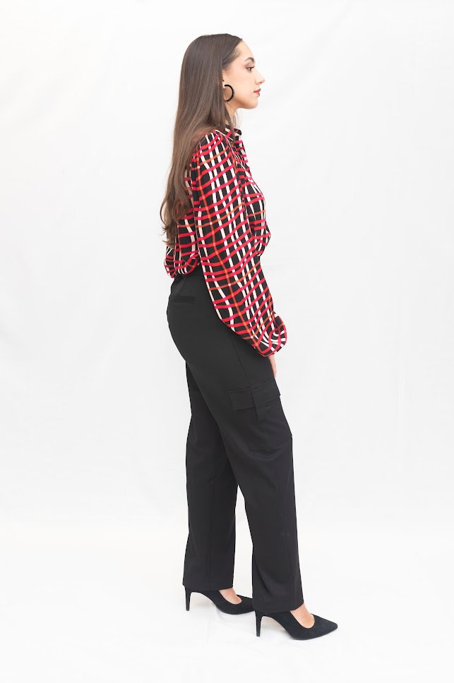 Pantalón cargo negro con finísima raya diplomática plateada, elegante y moderno, con bolsillos laterales y tejido fluido.