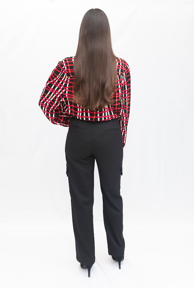 El corte recto estiliza visualmente la pierna, mientras que los bolsillos cargo laterales añaden un toque actual y funcional sin perder refinamiento. Es una prenda extremadamente versátil, ideal para ir a trabajar, para una comida especial, para eventos informales o incluso para un look de noche moderno y minimalista.